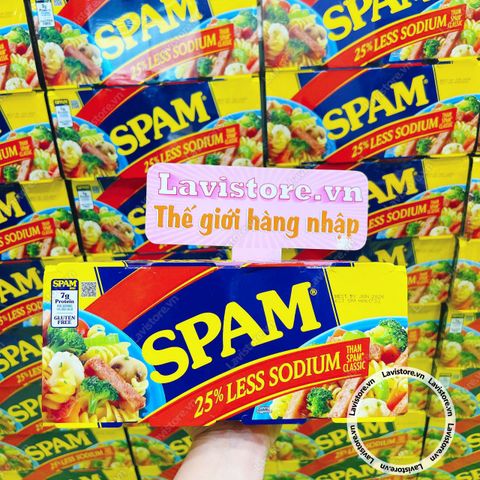 • Thịt hộp Spam 25% Less Sodium (340g)  được sản xuất từ thịt hòa trộn với các loại gia vị đường và muối đậm đà.
