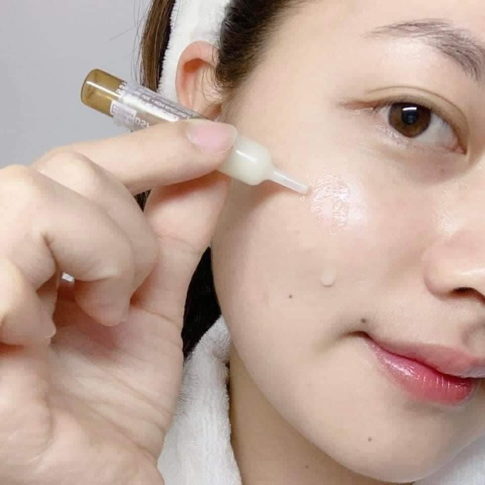 - Thoa lượng tinh chất bằng 1/2 ống ampoule lên da mặt, cổ và đường viền cổ.