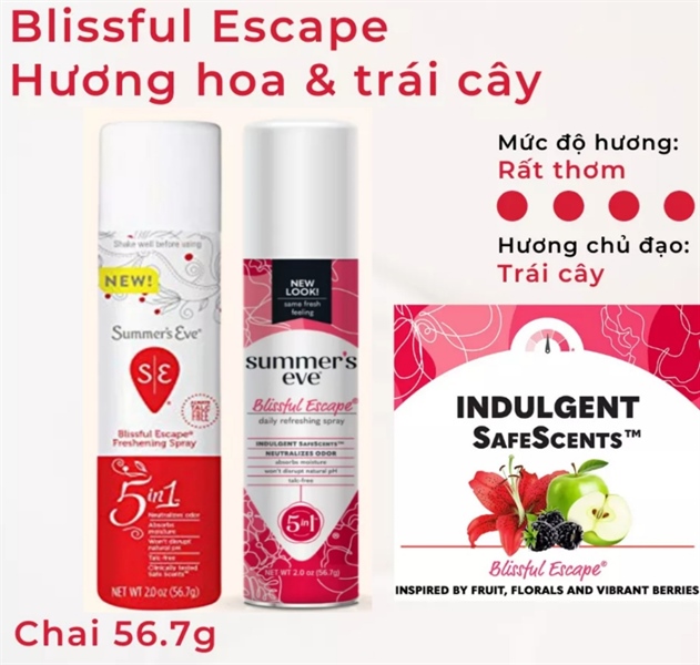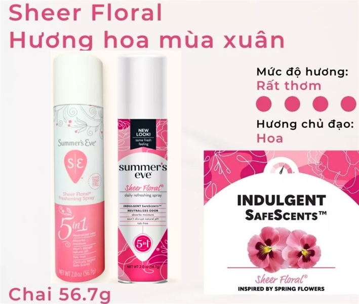 - Summer’s Eve là xịt phụ khoa chuyên dùng để xịt bên ngoài vùng kín nhằm tạo hương thơm tự nhiên, hỗ trợ loại bỏ những mùi khó chịu, có chứa isobutene pha trộn với bột ngô, dầu khoáng, lanolin và các thành phần khác có tác dụng hút ẩm, giữ cho vùng kín luôn khô ráo mỗi ngày